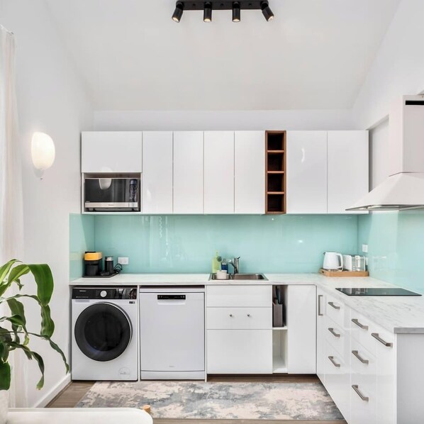 Kylskåp, mikrovågsugn, spishäll och diskmaskin