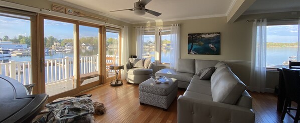 Radhus har 3 våningar, 3 sovrum, 3 badrum, på tredje våningen - ett sovrum med dubbelsäng och ett sovrum med 2 dubbla våningssängar och med tvillingar på toppen. Andra våningen - ett stort kök, vardagsrum och halv badrum. Första våningen dockningsnivå - Sovrum, TV-rum 17x25. med bord och bäddsoffa. Håll din båt steg bort. Ytterligare bryggor kan användas vid angränsande småbåtshamn eller kommunal brygga precis framför.