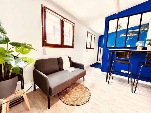 - A living room with TV (Molotov & Netflix), Wifi (fiber optic), sofa, dining area and a sleeping area separated by a glass roof with double bed (140×190).