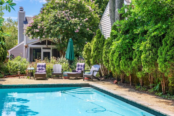 This 2 bedroom and 2 full bath maybe compact, (twin size Crate and Barrel sleeper chair and Half for additional guest), BUT She SURE packs a powerful punch!! TOTALLY open concept living area, caterers stocked kitchen (I’m a former catering company owner for 20 years, just trying to simplify), fully fenced in professionally landscaped yard with SO many colorful flowers, herbs and vegetables for the picking, functional and cute sunroom for additional living space amongst nature, endless entertaining, upstairs deck off of primary bedroom ... OFF STREET PARKING and Private FULL size .... YES... PRIVATE... pool in the heart of Eastport!