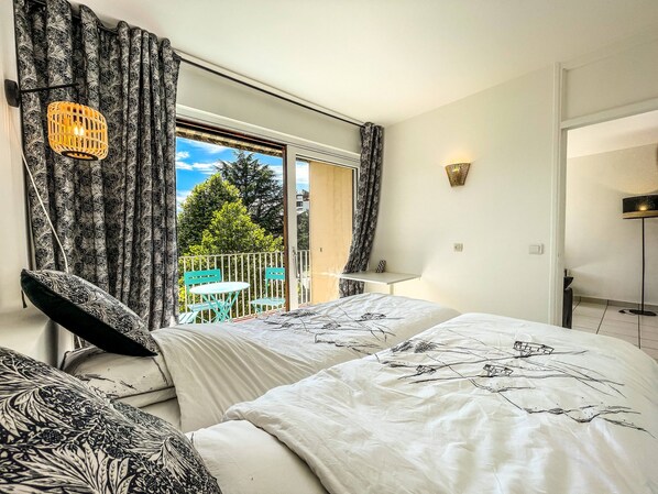 The apartment is located on the 2dᵉ floor with elevator of a large residence. It opens to a hall with access to the bathroom and toilet, then to the right the equipped kitchen open to the living room. This space is bright and has a large bay window with access to the balcony. The bedroom also has two single beds and its own balcony.