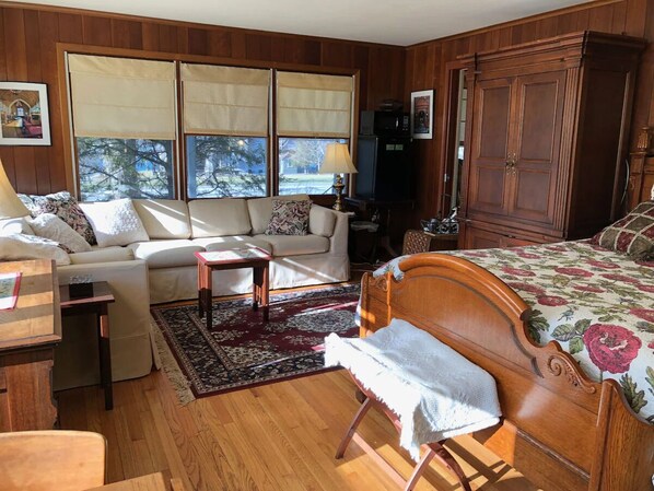 The location was very convenient and we loved that the wedding we were in town attending at the Inns of Aurora was just about a block away. The house was very clean and the kitchen very wellstocked. It would have been helpful to know in advance that one of the bedrooms was a walkthrough (unless you were ok using an outside door every time you left that bedroom). The beds were comfortable but we did not find the antique furniture in the living area comfortable at all. Also - instructions for how to use the 2 tvs would have also been helpful - even to know that if you have a Roku stick perhaps you might want to bring it with you. This was our first time in the Finger Lakes and it was absolutely gorgeous.