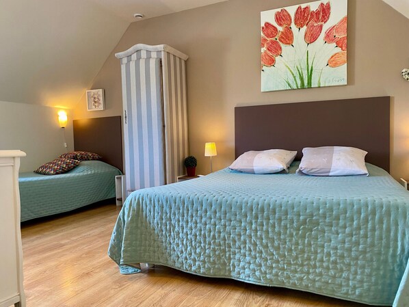 Upstairs: living room/living room (140x190 convertible) with kitchenette and large bedroom (160x200 bed + 90x190 bed) with adjoining bathroom/wc.
