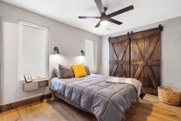 Three bedrooms: A cozy primary suite with a queen bed, a second bedroom with a queen bed, and a third bedroom with a twinxl over queen—perfectly set up as a kids’ room