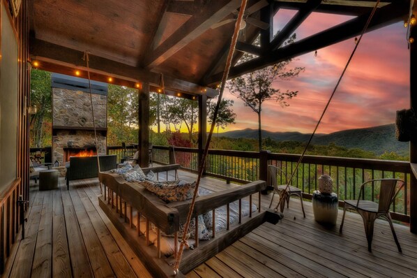 Step outside to experience the true magic of this cabin. The back porch offers stunning layered mountain views, a wood-burning fireplace for crisp evenings, and a dreamy swing bed for ultimate relaxation. Unwind in the hot tub as you soak in the serene surroundings.