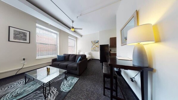 This efficiency suite features a fully-equipped kitchenette and living area. The flooring is carpeted throughout, with ceramic tile in the bathroom.