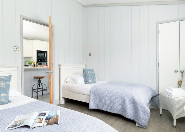 The equally spacious twin bedroom, also featuring its own ensuite shower room, offers flexibility and comfort for families, couples, or friends holidaying together.