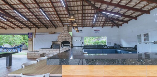 A cozinha completa inclui todos os utensílios necessários, como micro-ondas, forno, geladeira e fogão, facilitando sua estadia. A ampla sala de estar possui TV conectada a serviços de streaming e Wi-Fi de alta velocidade (600 Mbps), garantindo entretenimento e conexão constante.