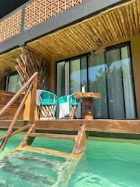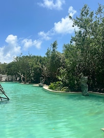 El personal, especialmente en el restaurante, fue tremendamente amable y atentos. Las instalaciones están curiosamente decoradas. La comida, aunque costosa y con poca variedad, es tremendamente rica. Originalmente entiendo que fuese un hotel 5 estrellas quizás en la apertura, con grandes ambiciones y zonas recreativas, ahora es un 3 estrellas en el mejor de los casos. Aparentemente el dueño anterior descuidó totalmente el establecimiento y una gran parte está en ruinas, cerrada o con arreglos caseros, tanto en las habitaciones como en la zona de la playa. La mayor parte de las instalaciones están cerradas y abandonadas. Están cambiando el sistema de agua, así que estuvimos sin agua un tiempo. Están arreglando todo y seguro que será de nuevo un hotel en su mejor forma, pero queda mucho hasta entonces. Mi recomendación para los dueños del hotel es que actualicen las fotografías publicadas en el anuncio para ser más semejantes a la realidad y así no llevar a equívoco a los visitantes. Otra recomendación es que vendan botellas de agua de al menos un litro, por cuestión de ecología al menos, cada botella de 400 ml costaba 35$ y no sé ni cuántas botellas de plástico hemos tirado después, una lástima. Y dado que en el manglar hay ciertamente muchos mosquitos, la venta de repelente en la recepción sería un acierto. Con todo esto dicho, agradezco al personal la atención y el buen trato.