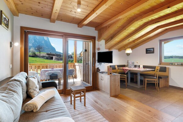 a spacious, fully equipped eat-in kitchen with a cozy corner bench and a sofa bed with TV&SAT;