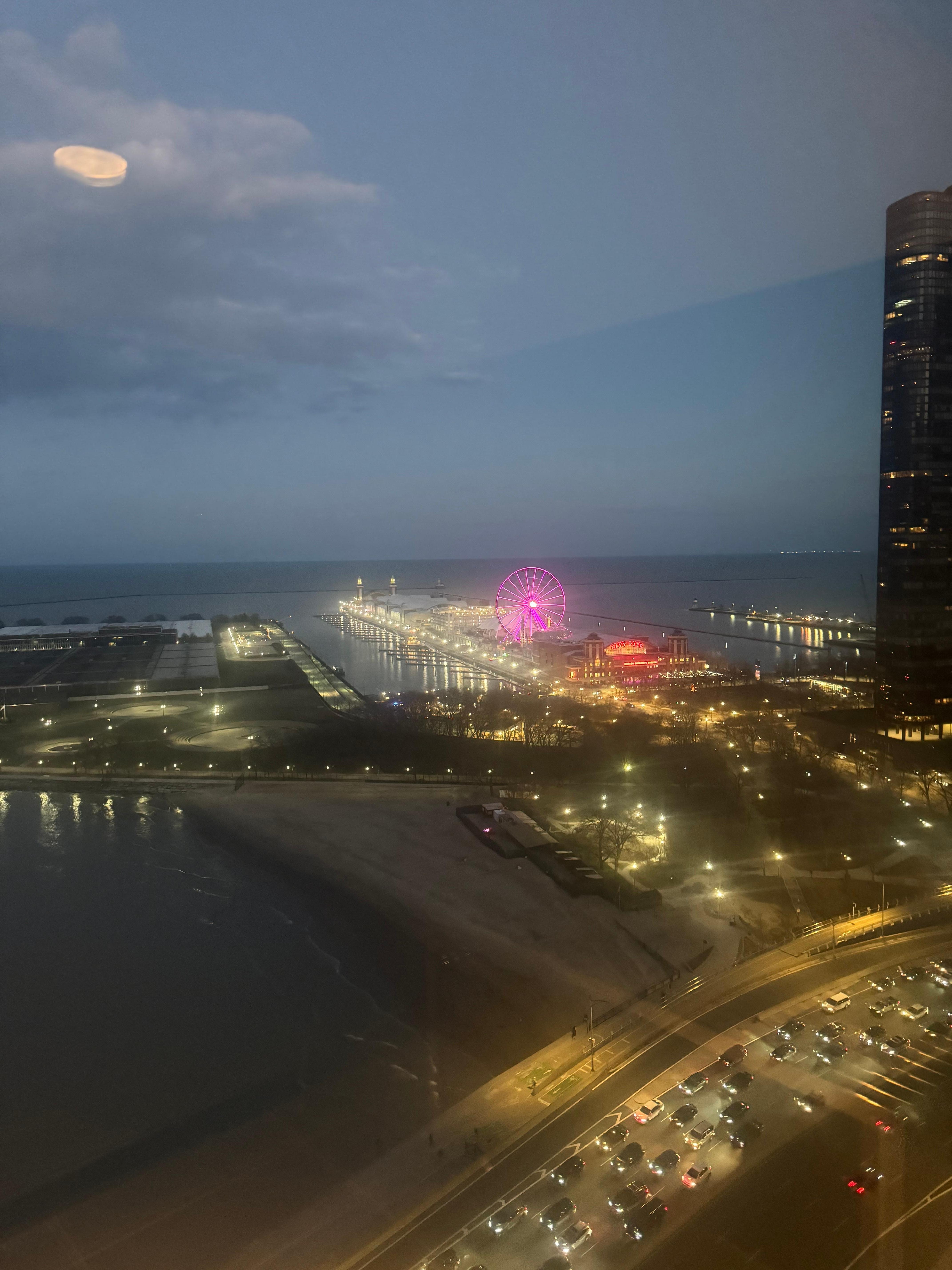 We had a nice view of Lake Michigan and Navy Pier. However, our check in was at 4 PM and we did not get into our room until 6 PM. We arrived shortly before 5 PM to check in. We waited in line for 20 minutes just to check in. When we finally got to the desk, we were informed that our room was not ready. There were 10 people ahead of us who also did not have a room and they could not tell us a time as to when our room would be ready. We waited in the lobby for probably 30 minutes, which was not terrible considering they couldn’t give us a timeframe. The concierge was rude about the situation and not accommodating. The least they could have done was comped us for the time we waited. Very busy hotel. Lobby always full of people. Our room was fine, average.