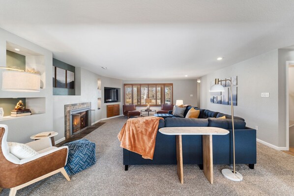 ⭑Living Room:⭑ Unwind in the spacious, newly appointed living room adorned with a large sectional, fireplace, 55” Sony Smart TV, sound bar, and subwoofer, cozy chairs with books to read while enjoying the warmth of the fire so you can relax in style.