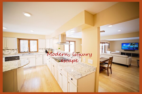 Top of the line kök med svart rostfritt stål Samsung apparater. 2 Vattenspegel Samsung diskmaskiner, 2 mikrovågor, modern kokkärl och Corelle middagsuppsättningar.