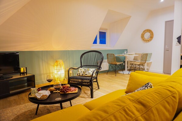 Located on the third and top floor of a building in downtown Concarnois, chalet is a duplex apartment that can accommodate two people during a stay in Concarneau. Its ideal location will allow you to access the shops, beaches as well as the closed city on foot, and this, in less than 5 minutes.