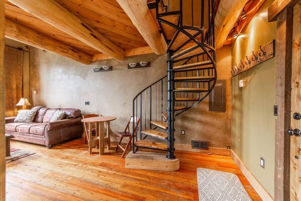This cabin has spiral stairs that may be unsafe for small children or people with ambulatory limitations. Please note, too, that the upstairs bathroom is open-air (there's no door or wall separating the toilet, vanity, and shower from the bedroom).