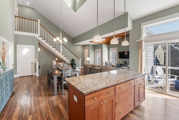 One thing the entire family will agree on when planning your next Outer Banks vacation... It's About Time! This luxury townhome is situated in the Beacon Villas community of the award-winning Corolla Light Resort. Beautifully decorated and meticulously maintained, It's About Time delivers the modern beach house vibes you've been searching for. High-end finishes throughout include Karndean LVT flooring, granite countertops, tiled walk-in showers, and a dramatic vaulted ceiling in the main living area with custom wood paneling. When you're not dining out, prepare meals at home in the well-equipped kitchen with stainless steel appliances and island with bar seating. All four bedrooms feature an attached bath for plenty of privacy. Downstairs, the rec room is furnished with a foosball table for some friendly competition, along with a comfortable seating and TV that can serve as a second living area. There's even a wet bar with full-size fridge for convenient drinks and snacks or storing extra groceries. This multi-functional space leads out to the screened porch with bubbly hot tub and a fenced-in patio with grilling area.
