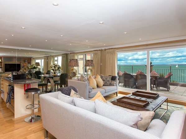 Glidande glasdörrar öppnar ut mot en stor privat terrass, perfekt för utomhusmat, underhållande eller bara koppla av på en solstol och titta på seglingsevenemang som Cowes Week och Round the Island Race.