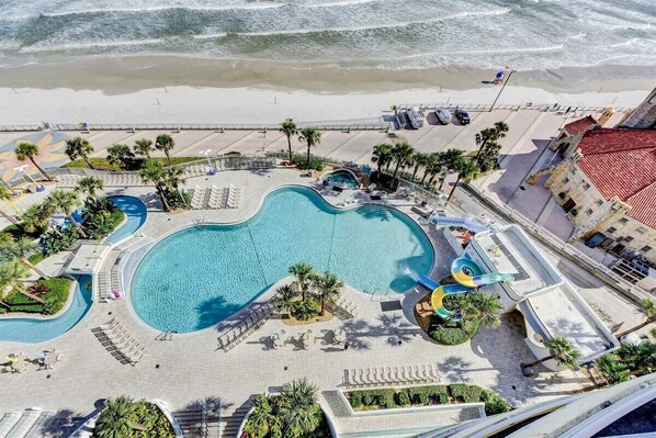 With free secure private parking and walking distance to the Boardwalk, Ocean Center, and Seabreeze clubs you don't need to go any where once your here. The amenities available to guests are amazing. From the massive ocean front heated pool, to the lazy river, to the hot tubs and kid splash and of course the beach, there will be plenty of ways for you to and your family to relax and enjoy the in the sun in style. The onsite Ocean Walk shoppes and restaurants are guaranteed to entertain. There is a movie theater when you are ready for a break from the sun, and so many restaurant options including Bubba Gump Shrimp and Sloppy Joe's. Its truly a great place to make long lasting memories.