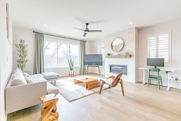 Lake level • Expansive open living area with walkout access to lake • Oversized windows provides an unobstructed lake view and maximizes natural light, accented by custom-made luxury curtains. • Full kitchen with brand new high-end appliances • Dining area with bench and dining chairs that comfortably seats 7. • Dedicated workspace with standing desk and ultra-fast Wifi • Brand new indoor infrared sauna • Large quartz kitchen island with designer walnut counter stools and designer pendant lights. • Brand new gas Fireplace • 65" smart television with complimentary Netflix access • Bookshelf filled with books, board games, record player • Surrounded by variety of lush houseplants, • Powder room