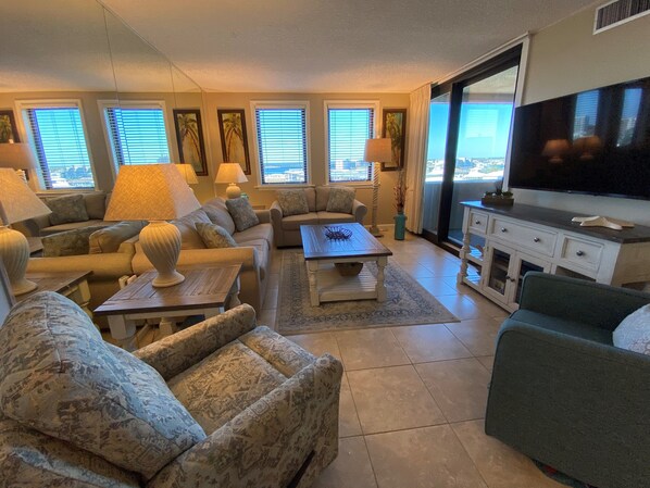 6th Floor - 2 Bedroom and 2 Bathroom Unit | This top floor unit was UPDATED 2020 with new beach cottage style furniture in the family area, installation of new ceiling fans throughout, and new flooring in the bedrooms. Brand new wall-mounted larger “Smart TV’s” were installed in all viewing areas which provide access to the most popular streaming sites. Your accommodations include a master suite with a king-sized bed and ensuite bathroom with a tub/shower combination. The guest bedroom includes a queen-sized bed and a full-sized bed for the younger set; or for separation of guests, there is a new sleeper sofa in the living area. Take a relaxing shower in the hallway bathroom including a vanity storage cabinet. Prepare your favorite meals in the renovated kitchen, which is fully equipped with all necessary utensils, extra pantry shelving, stainless steel appliances, updated cabinetry, and granite countertops. From this unit, you will enjoy terrific views of the ocean, East Pass, Lake Christina, Destin Harbor, and Crab Island. Enjoy a morning cup of coffee on the open balcony while watching the boats sail along the East Pass or enjoy a romantic evening dinner while viewing the breathtaking sunsets. You will also have a front row seat for fireworks displays and occasional aerobatics by local WWII planes. For outdoor fun, you are just “steps” away from the beach and the many resort amenities which includes our Pavilion for family gatherings, nightly entertainment, and other planned activities. Also, you are very conveniently located to local shopping, great restaurants and other harbor activities all of which ensure the perfect stay in unit 618B at Jetty East.