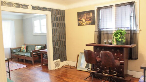 The living room is open adorned with solid classic furniture, it exudes a light modern flair for you to converse and relax. Adjacent to the living area, is a lounge area with a bar and eatery area to unwind for drinks or dinner next to a comfortable green couch.