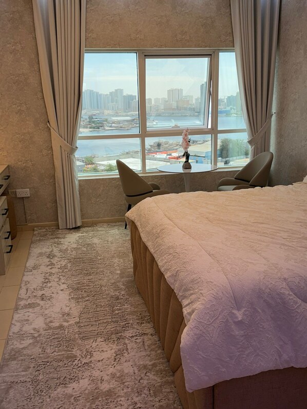 Samtliga rum hos Luxury Al Khor Waterfront Retreat Designer 1BR in Orient Towers Panoramic Views kan ståta med bekvämligheter som luftkonditionering samt internetanslutning.