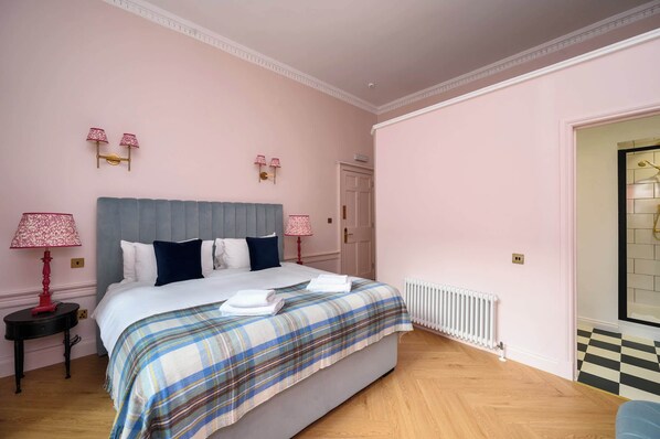 Tucked away above a quiet courtyard, this generously sized room is the perfect place to call home during your Edinburgh stay. A luxurious super-king bed and a stylish en-suite shower room provide both comfort and convenience, while thoughtful details throughout make the space warm and welcoming.