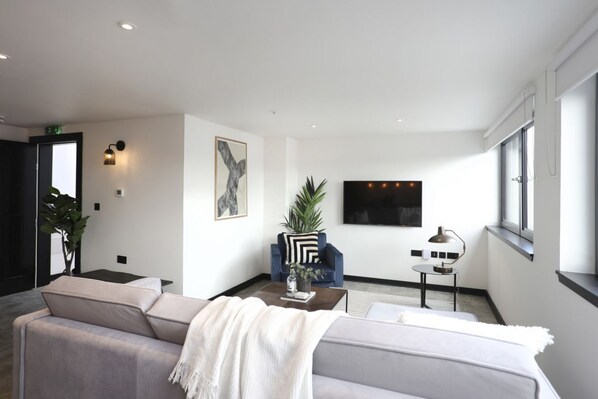 Each of the three contemporary bedrooms comprise a comfortable double bed, premium linens, a clothing rail and a dedicated workplace. Each bedroom has a bright shower room equipped with environmentally-friendly premium Laura Thomas shampoo, body wash and hand wash, as well as towels and a hairdryer. The apartment also has an additional toilet.