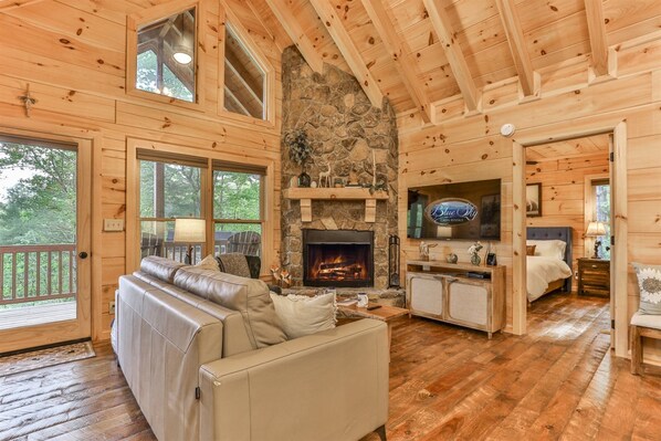 The living room has a wood-burning fireplace (a starter bundle of firewood provided Oct 1 - Apr 1) with 55' Smart TV (local Cable)
