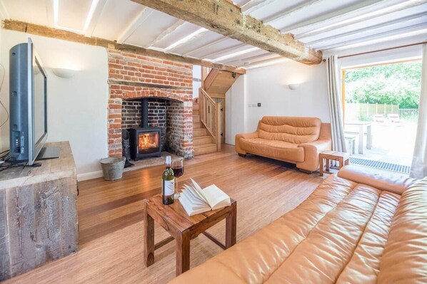 Living room with wood burner, two sofas and a smart TV