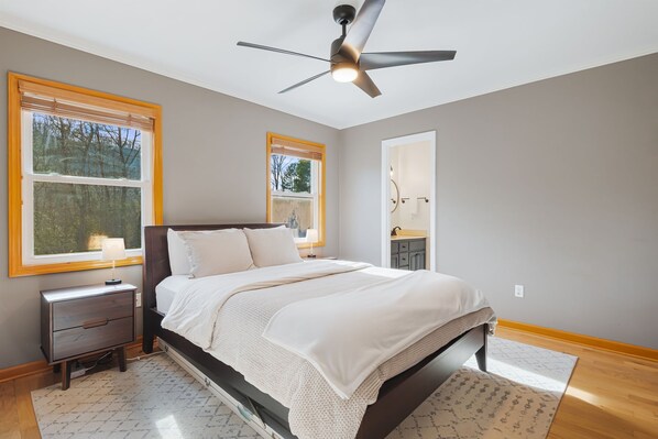 Our modern 4-bedroom, 2-bath retreat is thoughtfully designed with a minimalist touch, perfect for a relaxing getaway or productive work-from-home escape. The primary suite features a soaking tub and shower, while the second bathroom serves the additional two bedrooms, one with a queen bed and the other with two twins.