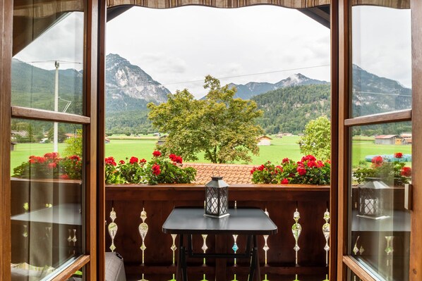 Vom Balkon aus kann man die Alpspitze und die Zugspitze sehen. Die Aussicht ist fantastisch.
