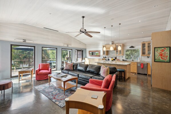 The open living room/kitchen was perfect for spending time together. The kitchen was well-equipped for cooking large group meals and everyone could socialize. We were a little unclear about how the main house and apartment were set up from the description (it's more of a 3+1 than a true 4 bed) but the arrangement worked out well for our group. We loved how close the house is to the beach and the fenced yard provided a safe place for the kids to play. It was an easy 15 minute walk to the restaurants and coffee shops (Folly needs some sidewalks though!). We had a great time here and thank you for letting us stay!