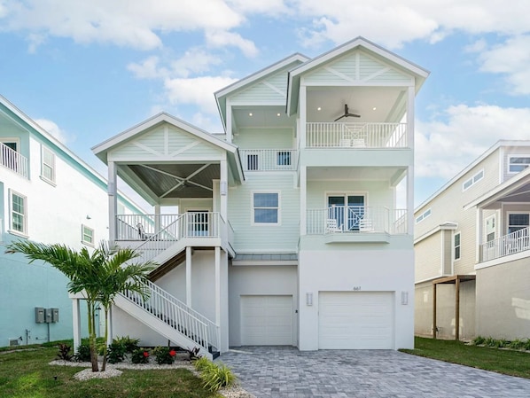 Beach-to-Bay” — a 5 bedroom/5 bath waterfront home — is located across the street from the beach along a canal on Estero Bay. With multiple balconies, the Key West-style home has amazing water views of the Gulf of Mexico or the back bay from every bedroom. Offering a great north-end location, it's located within walking distance of the Times Square area. The bright and comfortably furnished home has 5 bedrooms, 5 bathrooms, 2 large family rooms for entertaining, 2 laundry rooms, 2 wet bars, a well-equipped kitchen, and a saltwater pool and spa. There are 2 master suites, one on each floor. One has a stand-alone soaker tub & shower and the other has a walk-in “rainfall” shower with two shower heads. Every bedroom has a full ensuite bath! This huge family home includes an elevator that provides ground-level walkout access. Don't wait to book this magnificent new home.