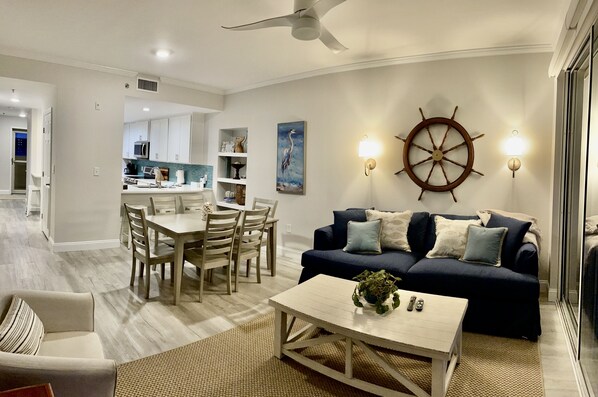 Step into a thoughtfully designed condo, where coastal nautical inspired decor and modern amenities create an inviting atmosphere. The open concept living/ dining area boasts ample seating, perfect for unwinding after a day at the beach.