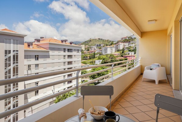 This apartment is in a building in the parish of São Martinho. It is on the 7th floor and consists of a living room with a sofa bed for two people, and a bedroom with a double bed. Both rooms have access to the balcony. There is also a bathroom with a bathtub, a pantry, and a well-equipped kitchen with a laundry area.