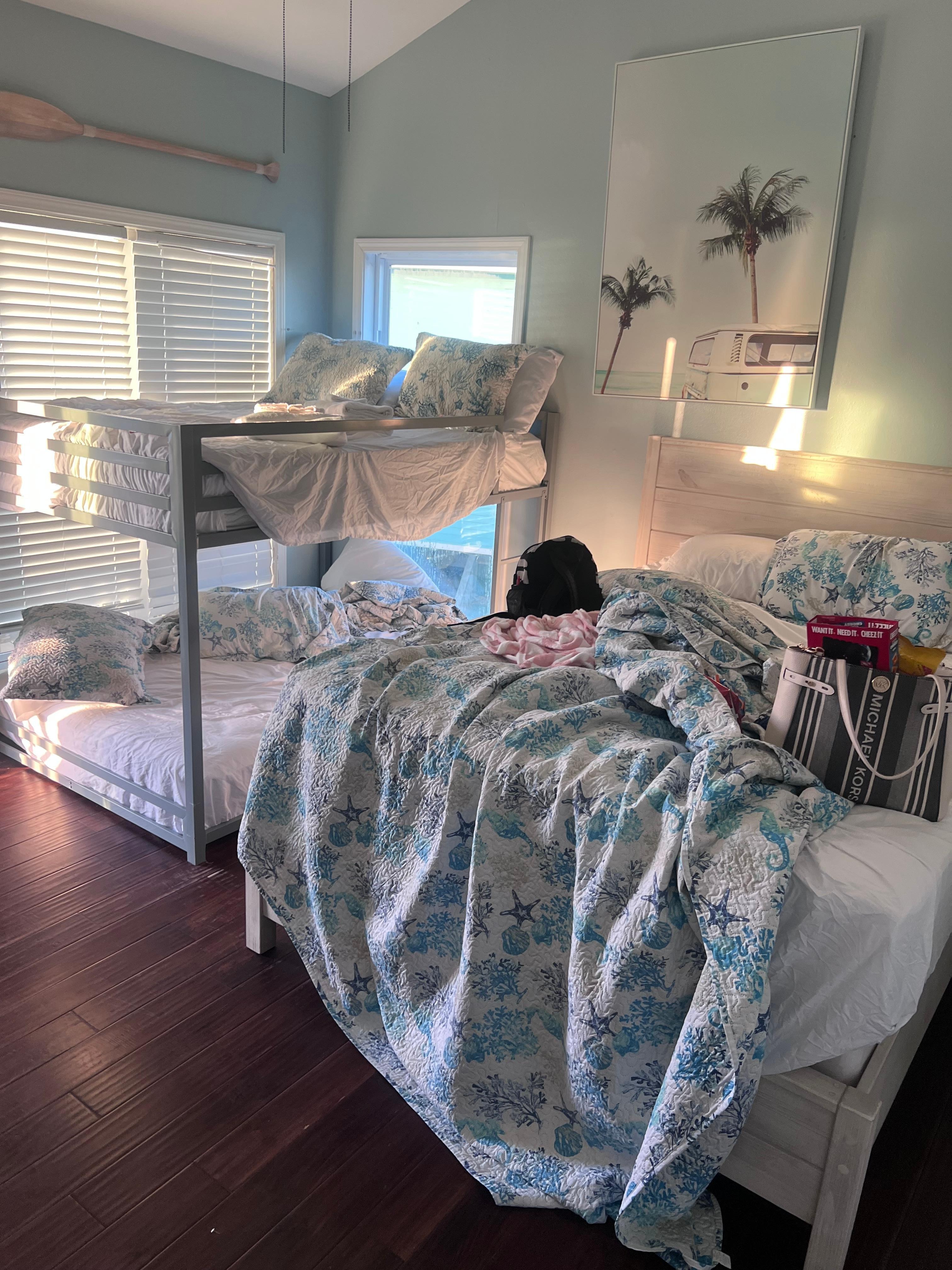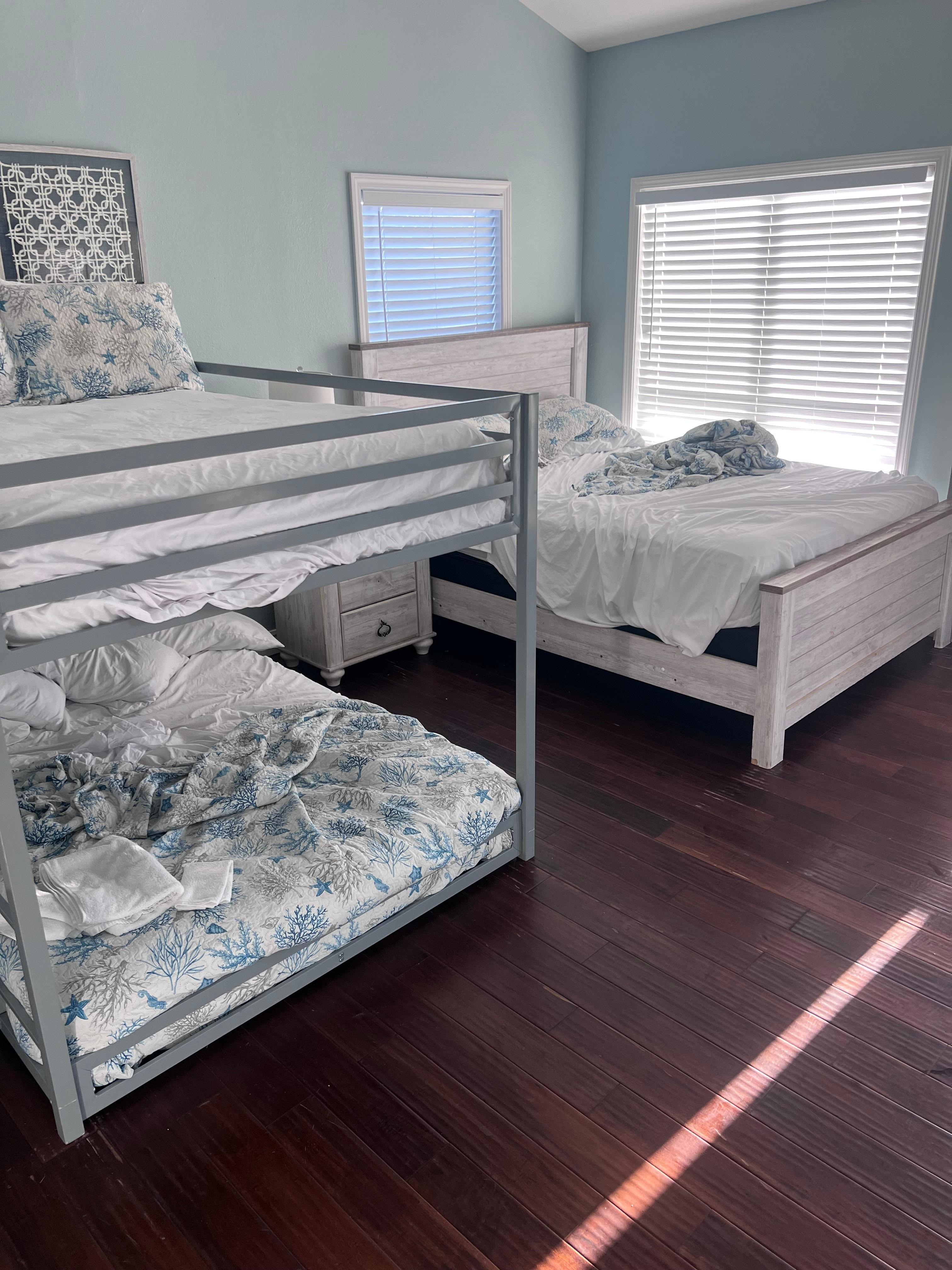 On the third floor, the master suite is massive. Sink down into the luxe king-size bed after a long day on the water. Flowing white curtains frame the large windows that look out over the ocean. The master bathroom has a double vanity and a step-in shower with a glass door and detailed tile work. A second bedroom on the third level has a queen-size bed and full-over-full bunk bed, access to the deck, and an ensuite half bathroom. A laundry nook lies just around the corner. The third bedroom also has a queen-size bed and full-over-full bunk bed with an attached bathroom with a step-in shower.