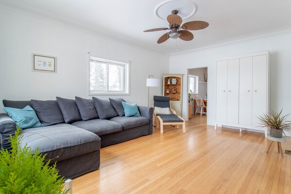 Large living room is a great place to gather and unwind. It has comfortable seating, along with a pull-out queen bed with linens and pillows under the chaise. TV mounted in living room for streaming services, DVD player and some DVD’s also available.