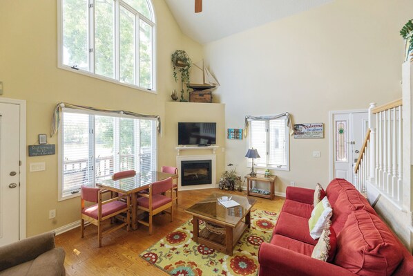 This beautiful two-bedroom, two-bath, two-story condo with a loft offers stunning water views overlooking the bay. The living room features a cozy fireplace with a flat-screen TV mounted above it, perfect for relaxing evenings. The upstairs bedroom includes a king-size bed, while the downstairs bedroom has a queen-size bed—both equipped with cable TV and DVD players. Please note: this condo is non-smoking and pet-free; however, the owner is a pet owner, and while our housekeepers maintain the unit to a high standard, we cannot guarantee it is completely free of allergens or animal dander. Conveniently located, you’ll be just a short walk from boat rentals, a playground, and one of two outdoor pools.