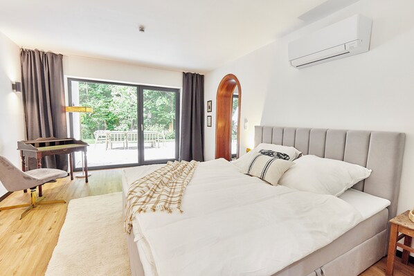 Welcome to HAUS28, a lovingly refurbished A-frame that radiates warmth from the very first moment. As you step inside, floor-to-ceiling windows draw your gaze straight into the tranquil forest—nature’s own embrace. On the ground floor you’ll find two spacious bedrooms, sharing a sleek modern bathroom and each with direct access to the terrace. At dawn, soft light pours through the large panes while crisp woodland air invites you to savor your first coffee outdoors.