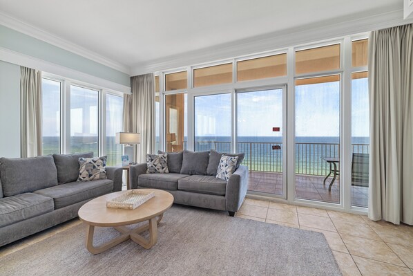 The living room, with its floor-to-ceiling windows, provides breathtaking South and West views of the Gulf. It's furnished with a comfortable sofa sleeper and a grand 70-inch flat-screen TV, making it a perfect spot for group gatherings or movie nights.