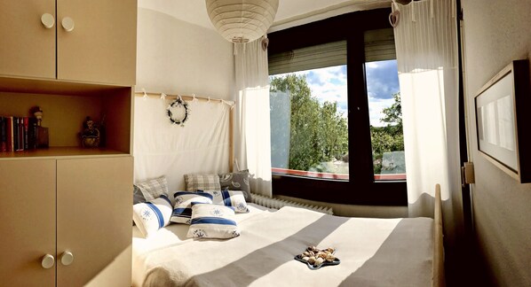 Alla fönster kan mörkras helt med fönsterluckor efter behov. Fönster i sovrummet och balkongdörren är låsbara.