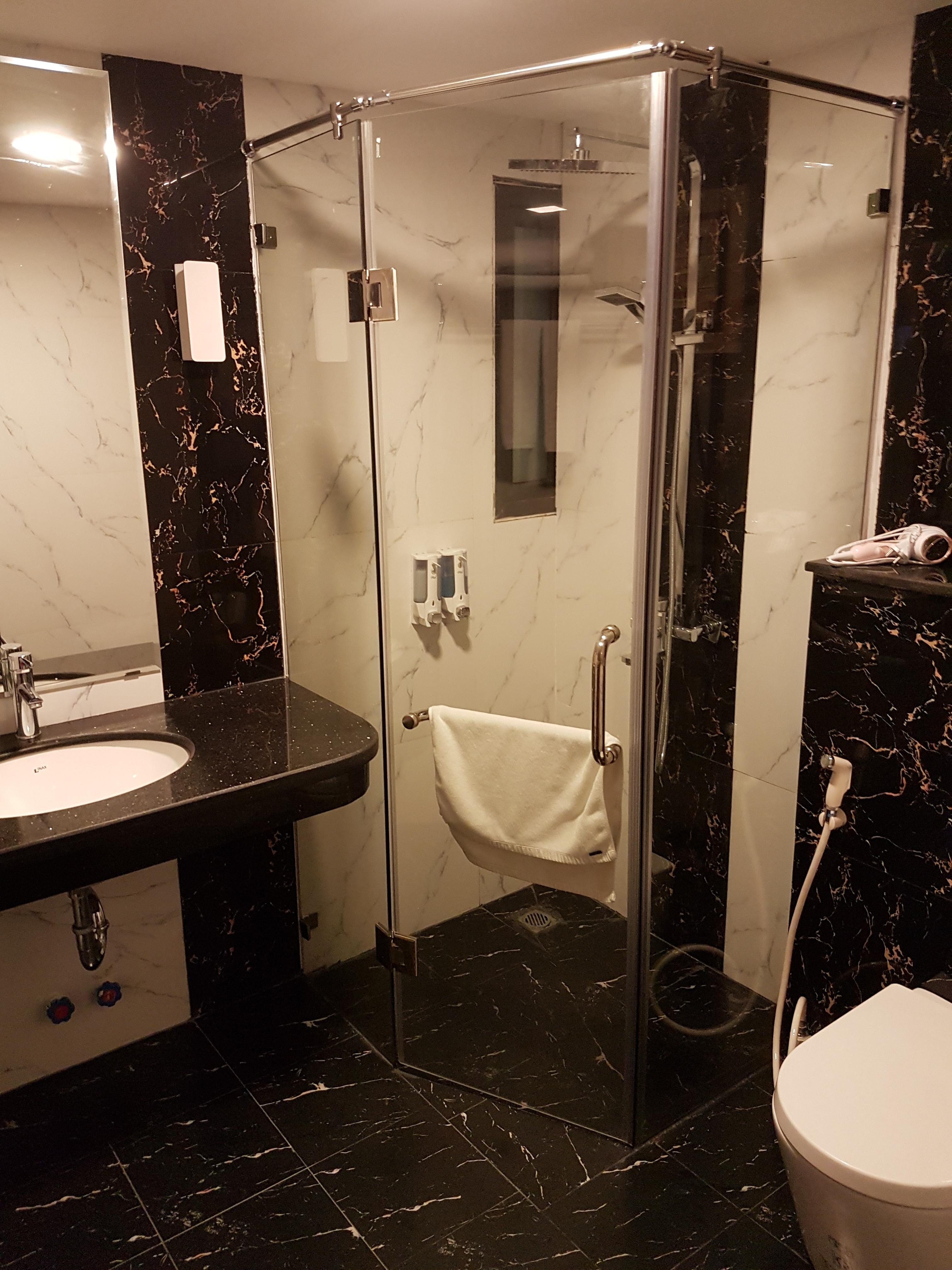 New renovated bathroom, look very modern and clean. But they make some difficulties, window can't be closed and have a noisy machine just outside, make problems to have a good sleep !