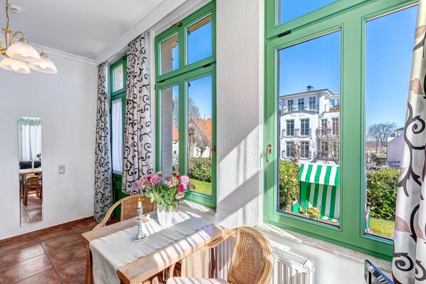 Den mysiga 2-rumslägenhet nr 5 har en separat ingång och ligger på bottenvåningen i Villa Ostseewarte i badorten Ahlbeck, bara 2 minuter från Östersjönstranden. Den har ett separat sovrum med dubbelsäng och ett vardagsrum med bekväma sittplatser som en extra säng kan göras för en tredje person. Den integrerade Köket är utrustat med diskmaskin, mikrovågsugn, kaffebryggare, vattenkokare och brödrost. Badrummet har en dusch och toalett. Lägenheten har dessutom en stor terrass med trädgårdsmöbler och en solstol. En parkeringsplats finns på fastigheten gratis och cyklar kan rymmas på fastigheten i ett separat förråd. Alla lägenheter på Villa Baltic vänt har lösenordsskyddad hög hastighet trådlöst internet (enhet bundna, € 1,50 per dag per enhet). En tvättmaskin kan du använda (mynt) mot en avgift.