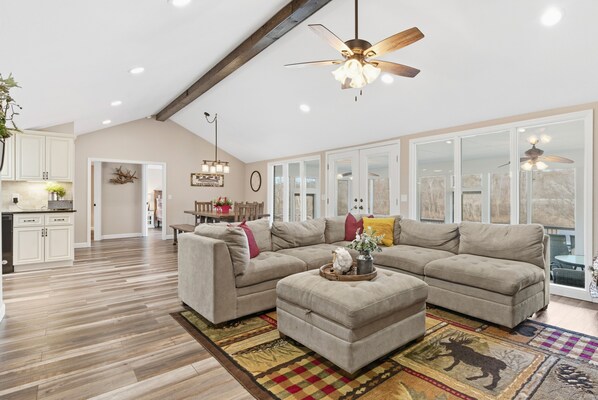 The main level offers a thoughtfully designed layout with one king bedroom, two queen bedrooms, and a private king suite with a walk-in shower, along with a beautifully updated hallway bath. The open living space features a fully equipped kitchen, a generous dining area for 8–10 guests, and a convenient laundry room with a full-size washer and dryer. The lower level has two queen beds and a full bathroom with a clawfoot tub (no shower), making it a great space for kids with the pinball machine nearby.