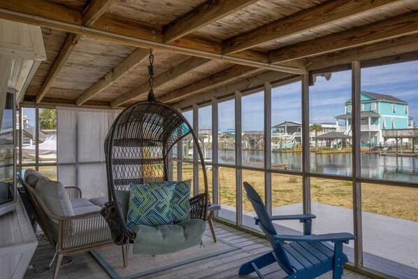 Wraparound Screen Porch: swinging basket chair, rattan sofas, Adirondack chairs, outdoor dining table seats 6, woven side chairs.