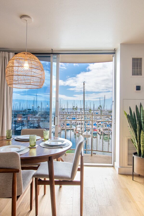 Step into a bright and airy beautiful condo, where modern elegance meets coastal charm. Expansive windows invite natural light to flood the open living space, offering breathtaking views of the marina and the sparkling Pacific Ocean.