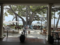Pool och bar: Fin inramning med uråldriga träd, stranden, havet och, inte minst, gungstolarna vid fastigheten. Området skulle behöva en uppfräschning ( vad vi förstår ligger det i planen). Det är långt ifrån dåligt, men matchar hotellets helhet och image dåligt.