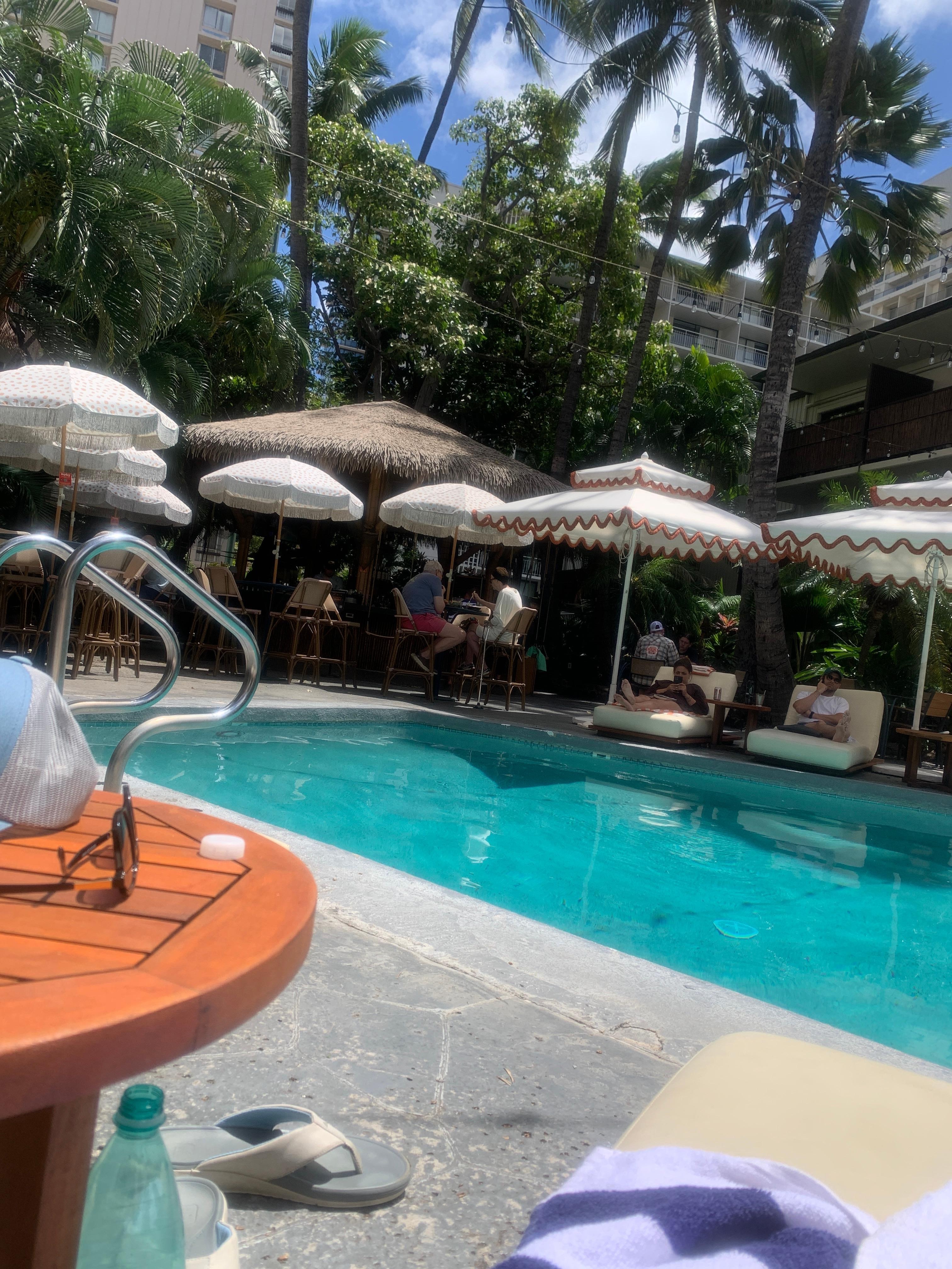 White Sands Hotel is a wonderful little gem set in the heart of Waikiki. It's not fancy but the rooms are comfortable and there is a quaint tiki bar with swinging chairs and delicious food. The pool is small but offers comfortable loungers and other seating in a comfortable tropical surrounding. The area offers lots of restaurants, cafes and shopping very close by which makes it a perfect location for an affordable, comfortable stay.