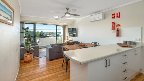 Bo: Öppen planlösning med glidande glasdörrar som leder till balkongen. Plattskärms-TV och DVD-spelare.